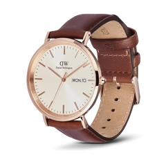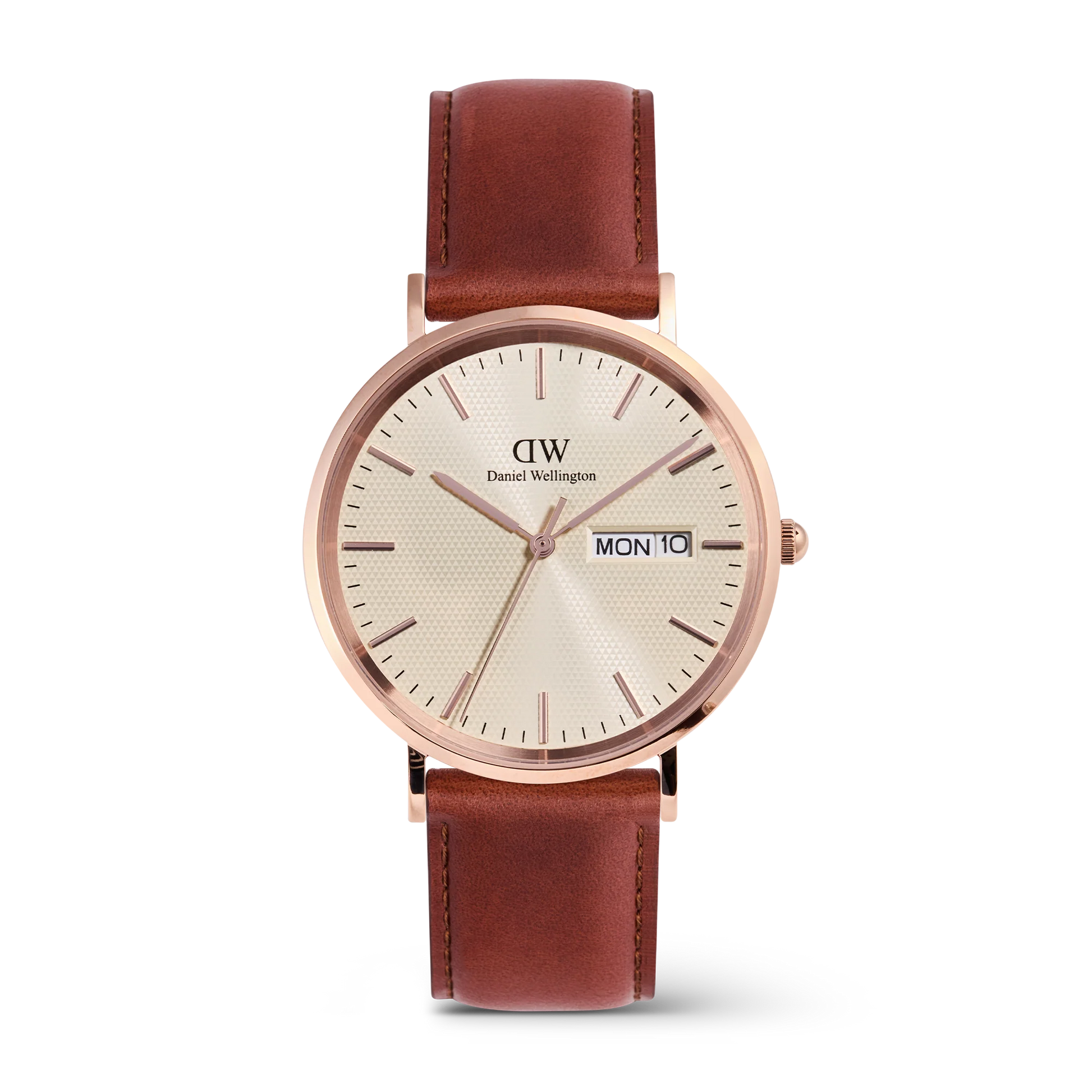 هذا الموديل يُعرف بـ Classic Day Display في مجموعة Daniel Wellington، ويتميز بإضافة نافذة تعرض اليوم والتاريخ ضمن الميناء، مما يجعله عمليًا إلى جانب تصميمه الأنيق.
